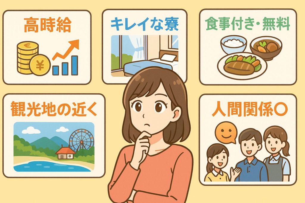 まず最初に職種、勤務地、期間、寮などの環境、どれを重視するのかを決めましょう。